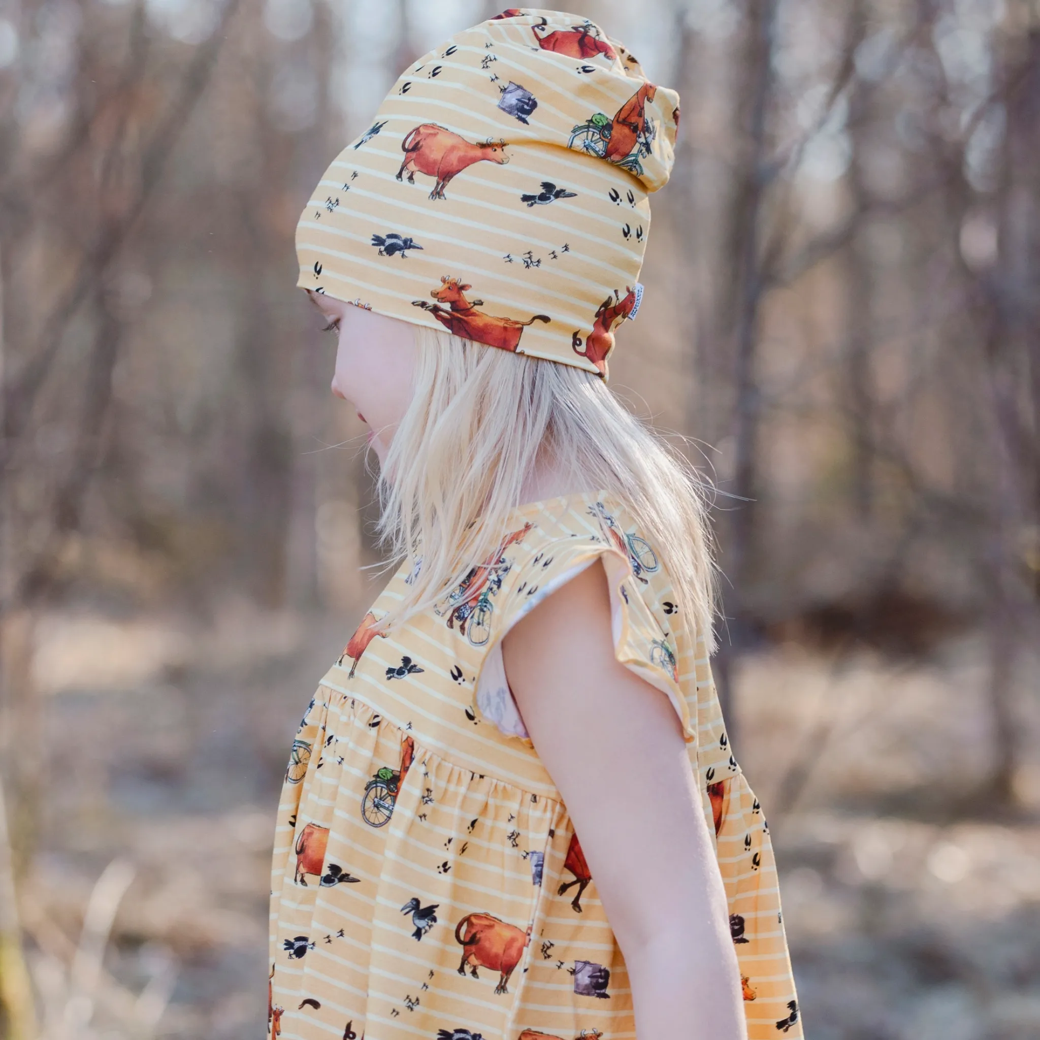 Mössa med Mamma Mu print. Mössan är i Ekologisk bomull och har Geggamojas härliga passform som passar alla, liten som stor.