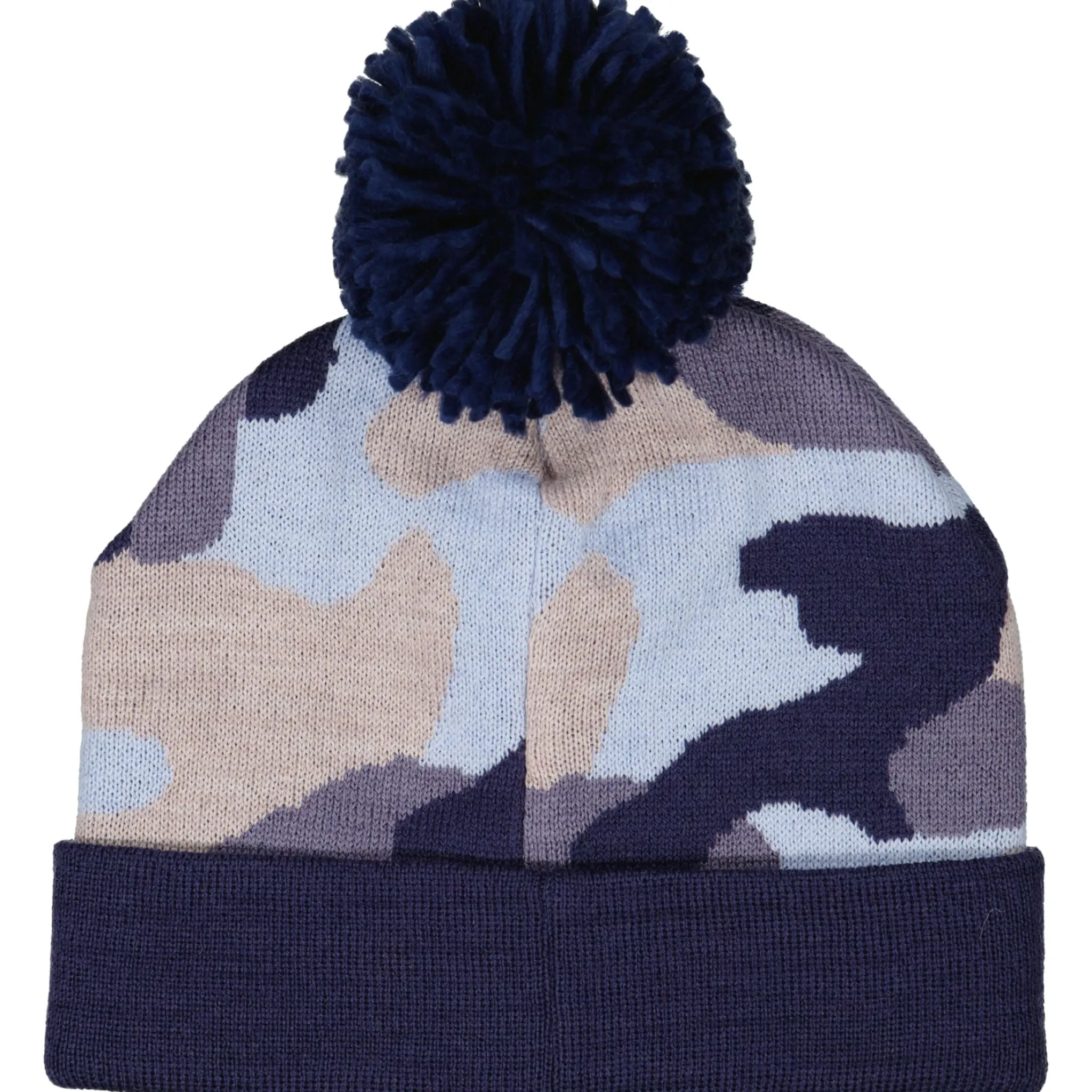 Stickad mössa med tofs som är både varm och skön. I vårt populära kamo mönster i blått.