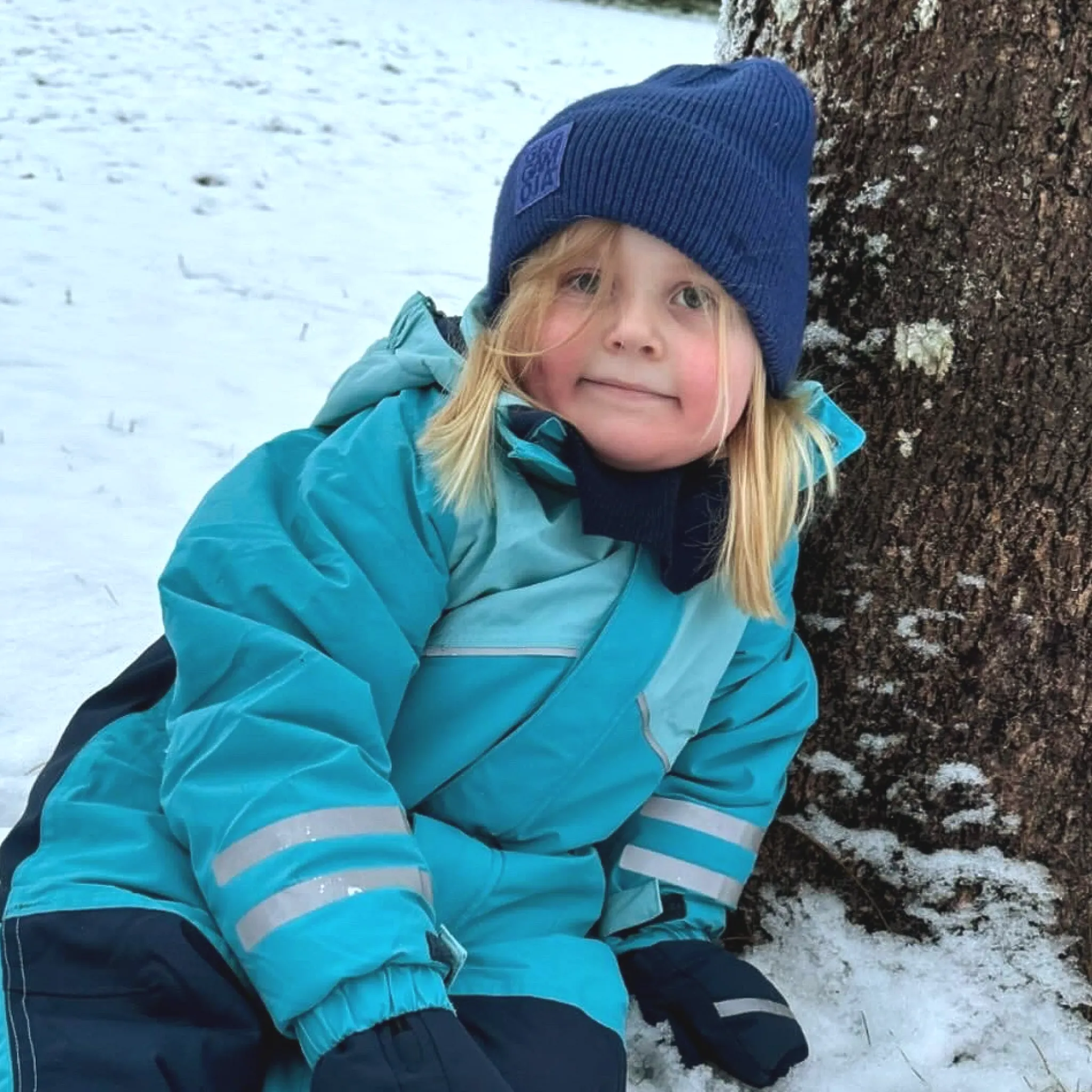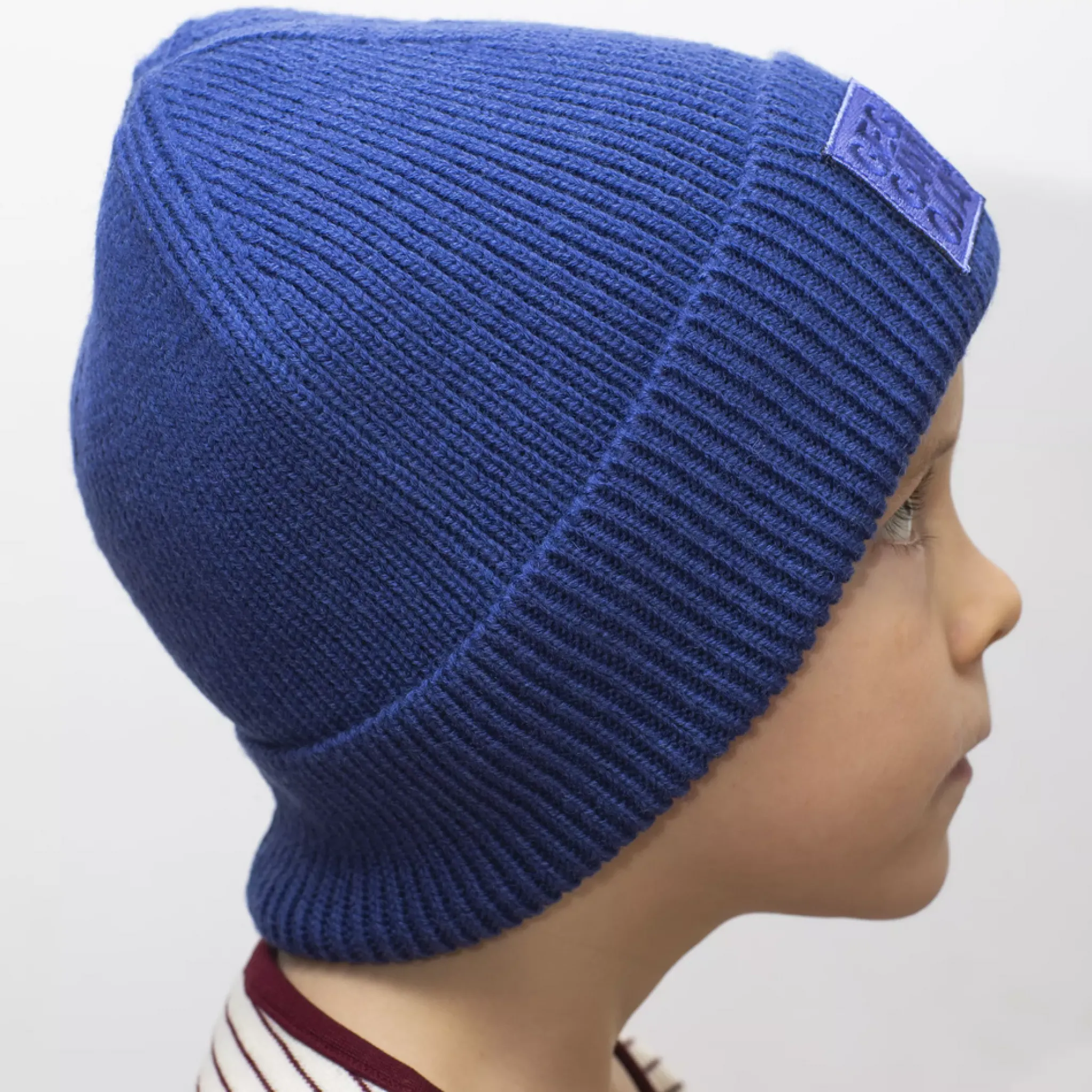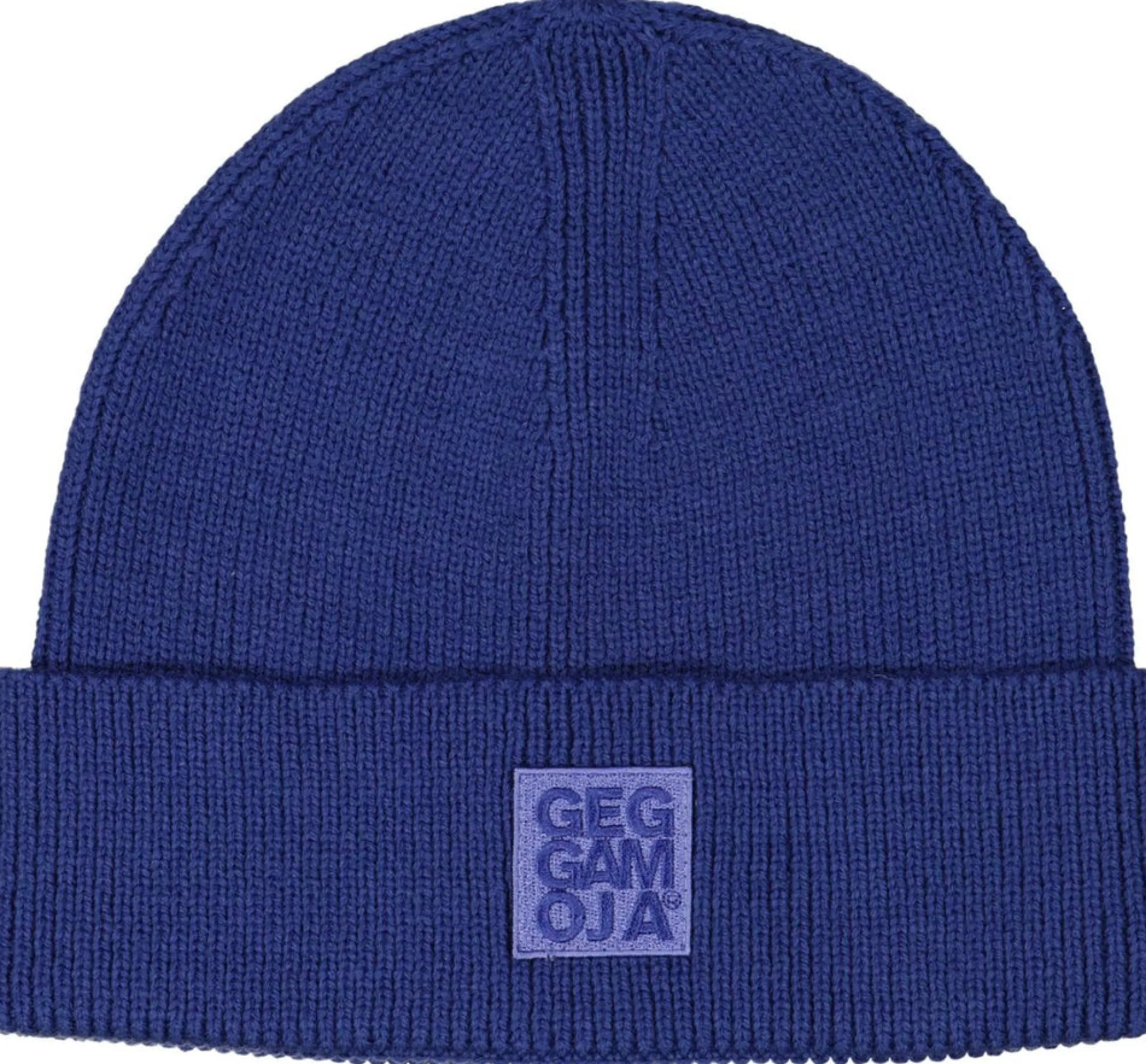 Stickad mössa i blå härlig färg. Mössan är stretchig och har en bra passform. Den har en vikt kant med Geggamojas logga på.