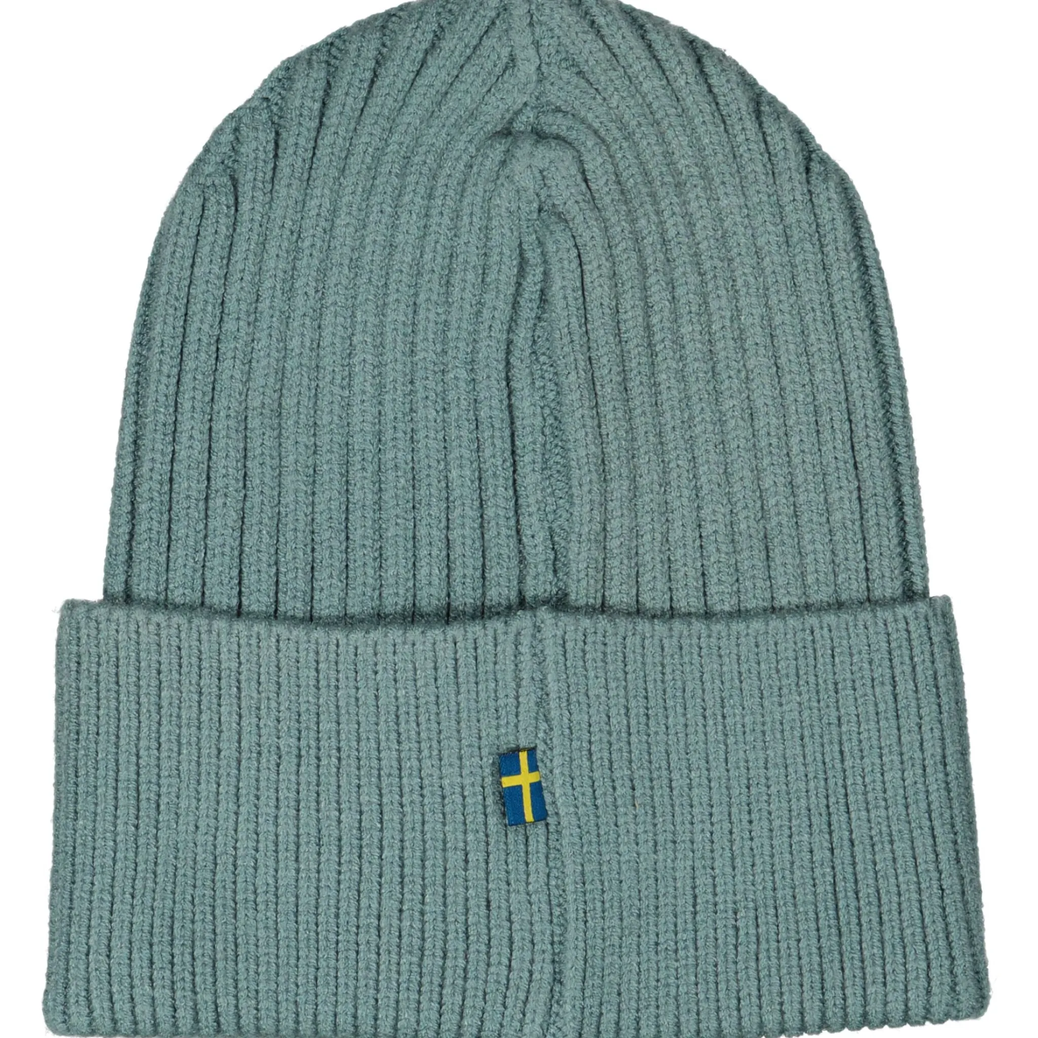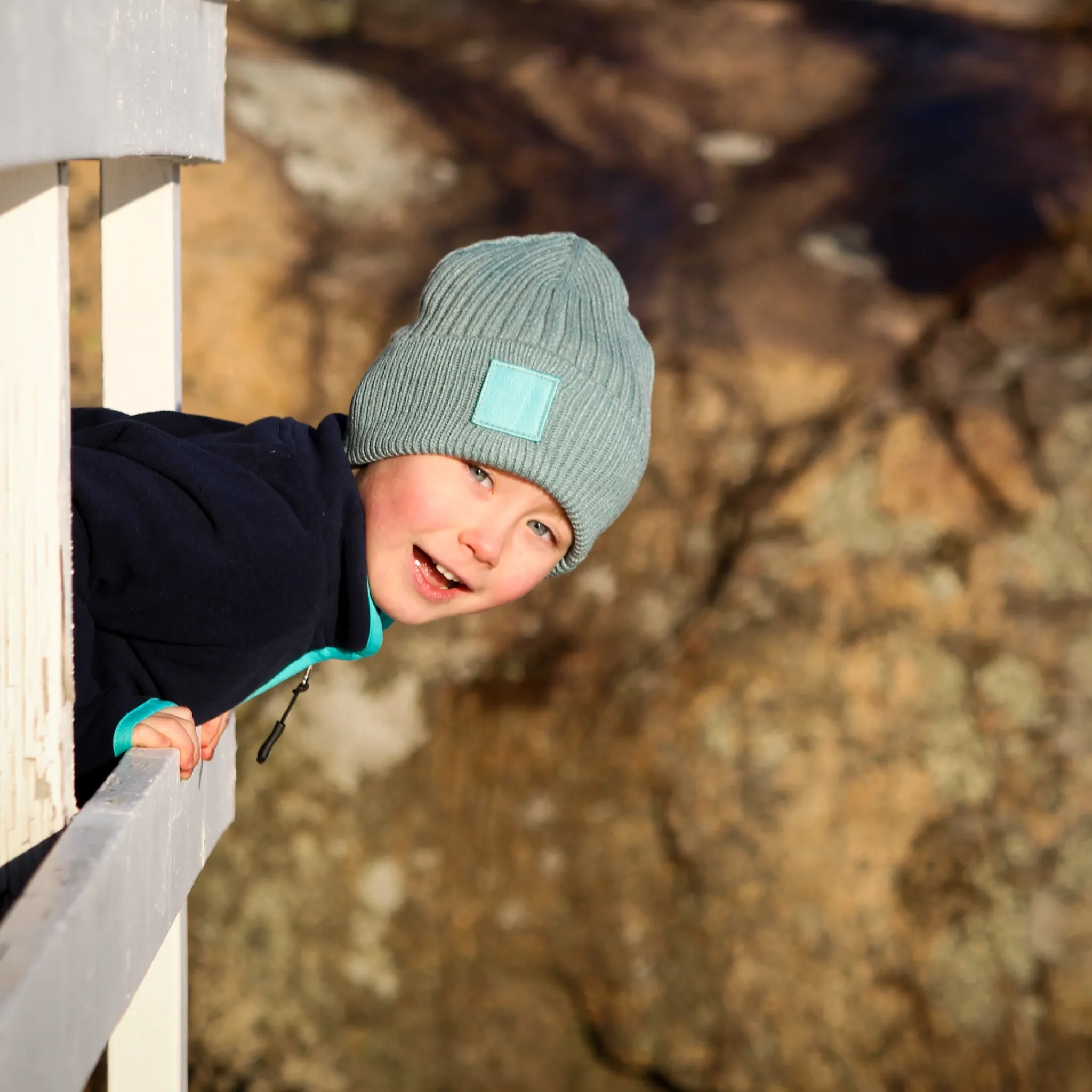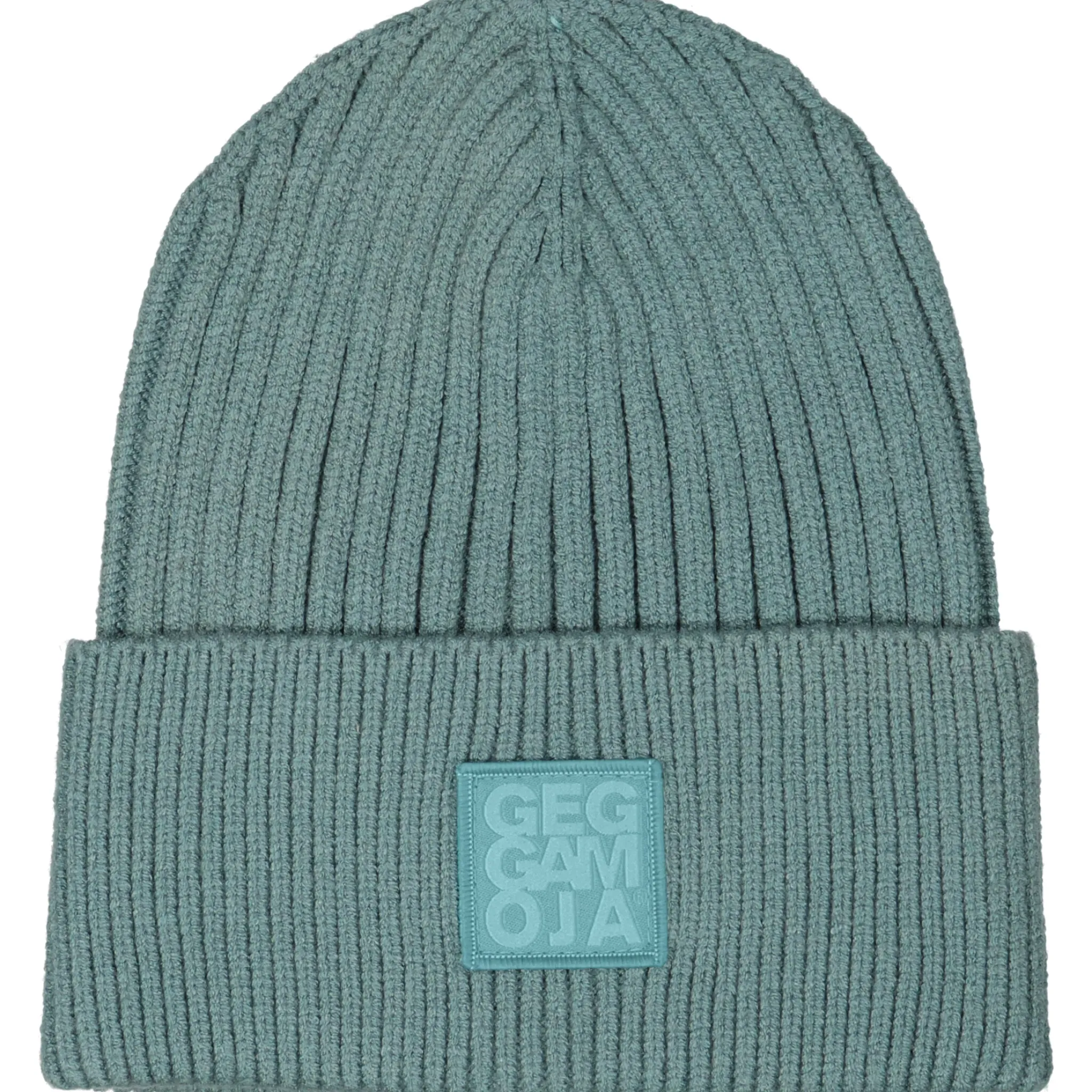 Stickad mössa i mint. Mössan är stretchig och har en bra passform. Den har en vikt kant med Geggamojas logga på.