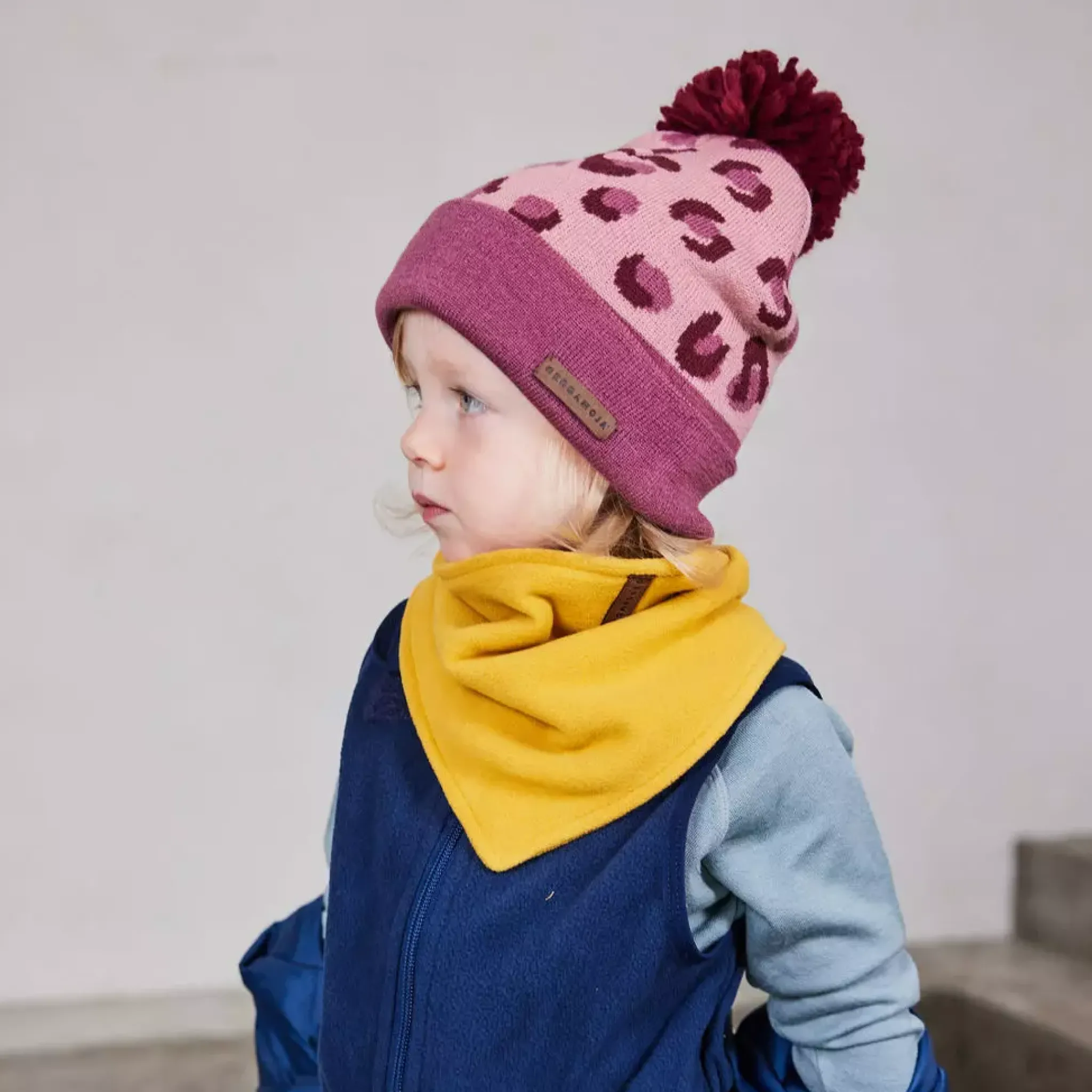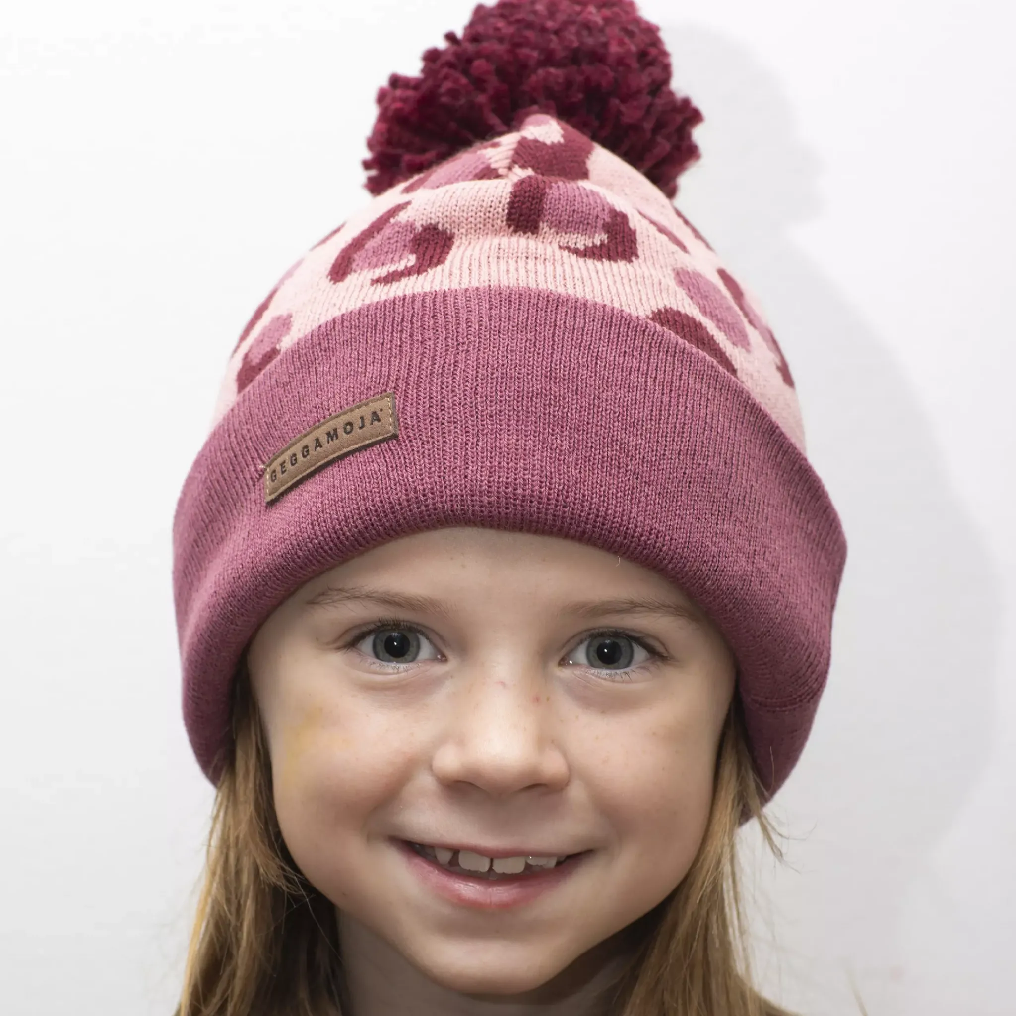 Stickad mössa med tofs som är både varm och skön. I vårt populära leo mönster i vinröd och rosa.