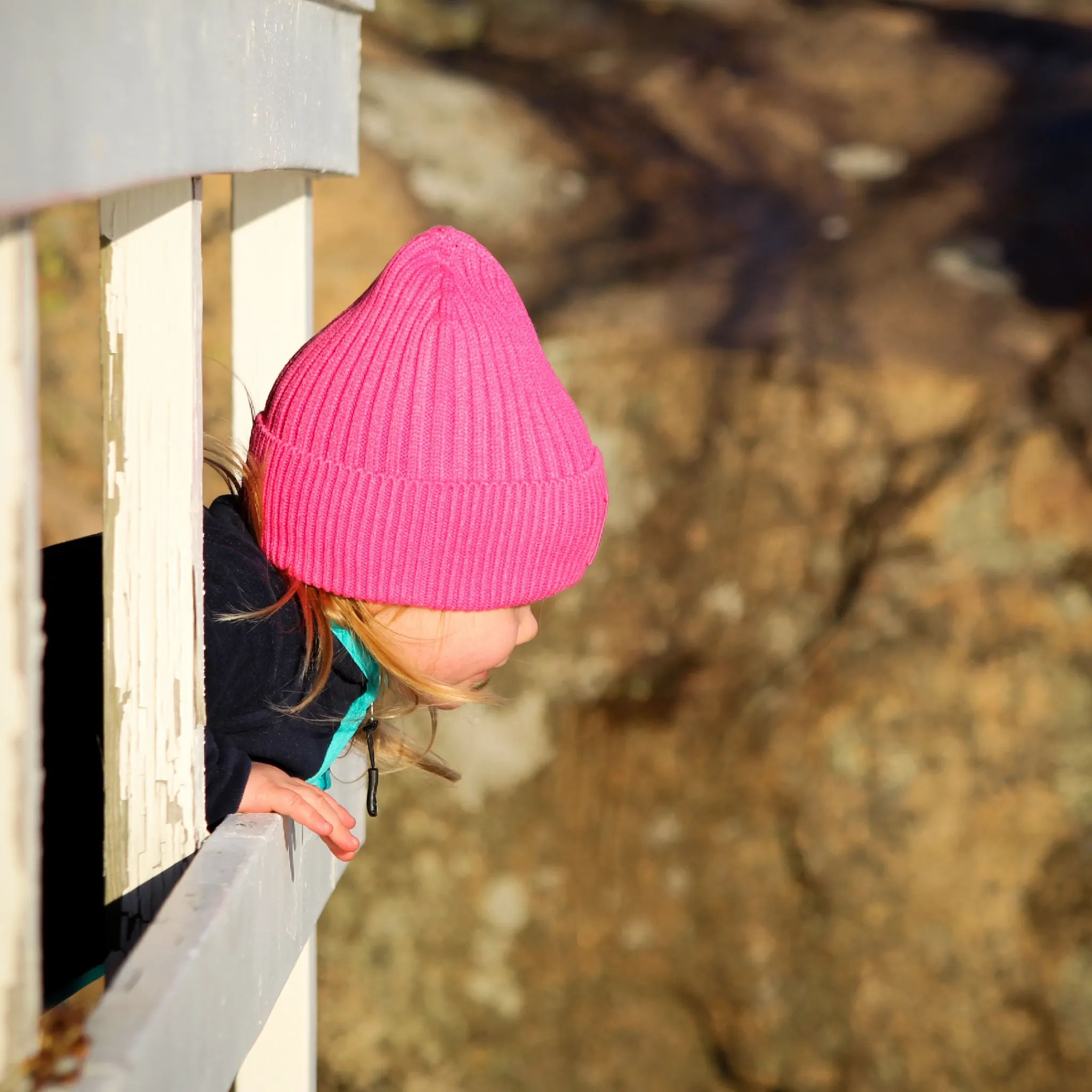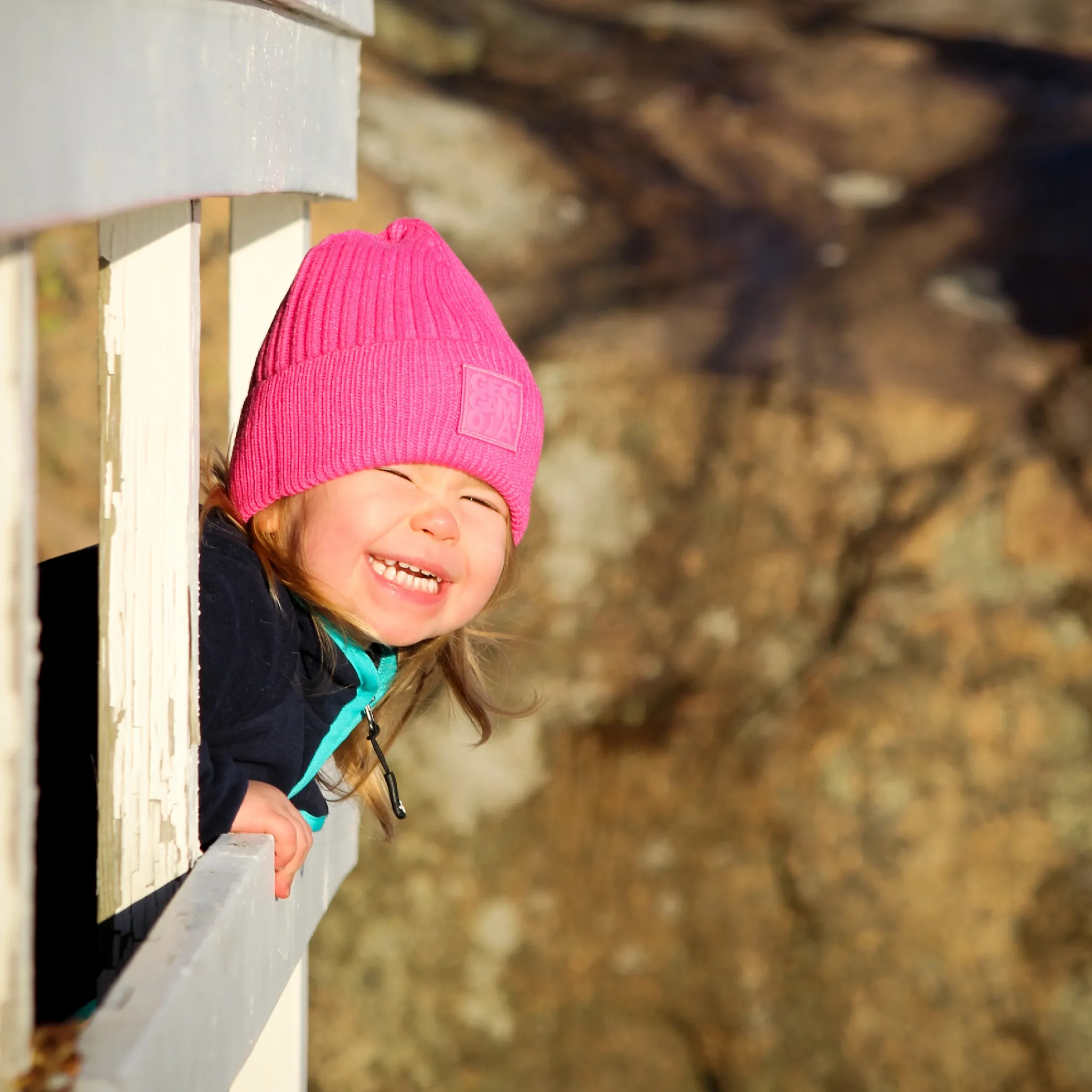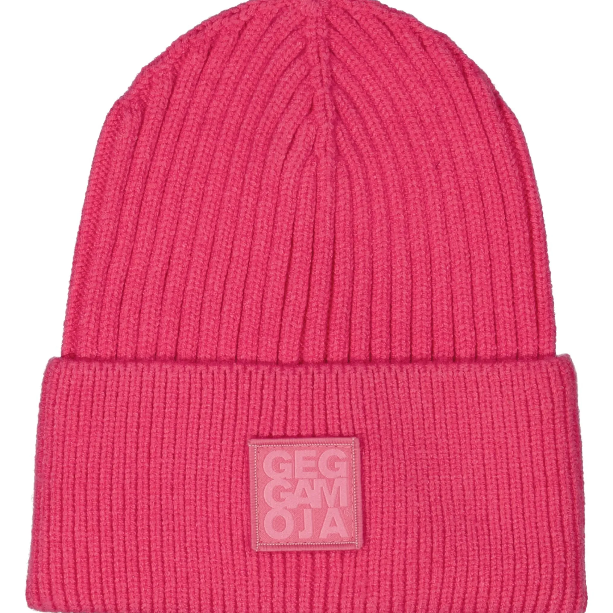 Stickad mössa i rosa. Mössan är stretchig och har en bra passform. Den har en vikt kant med Geggamojas logga på.