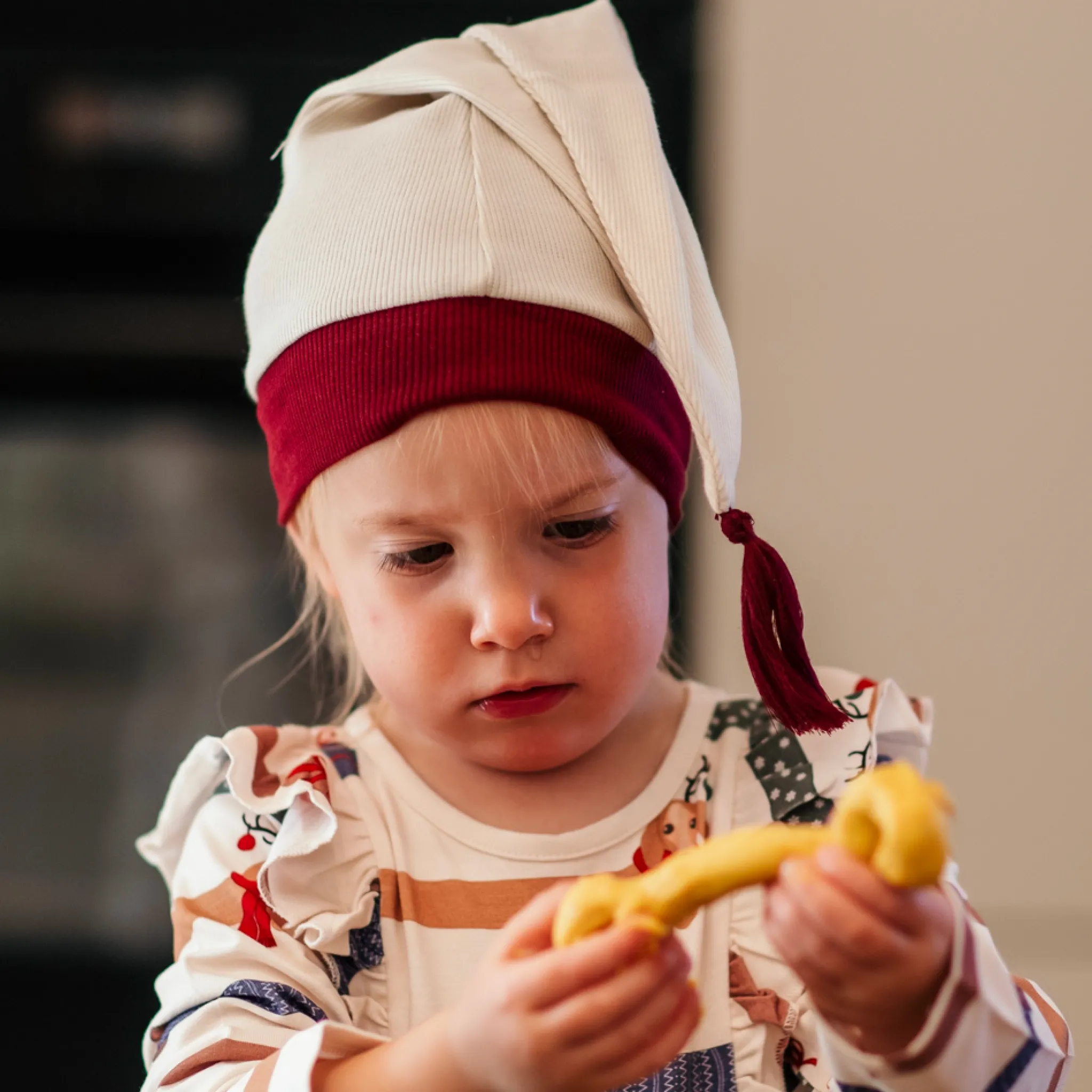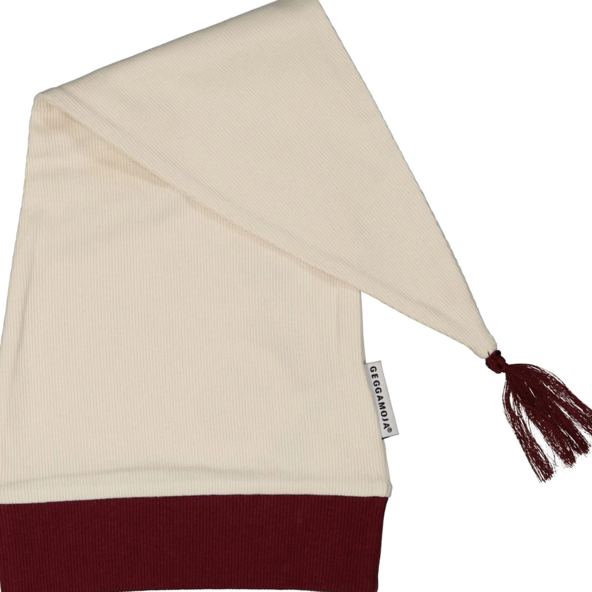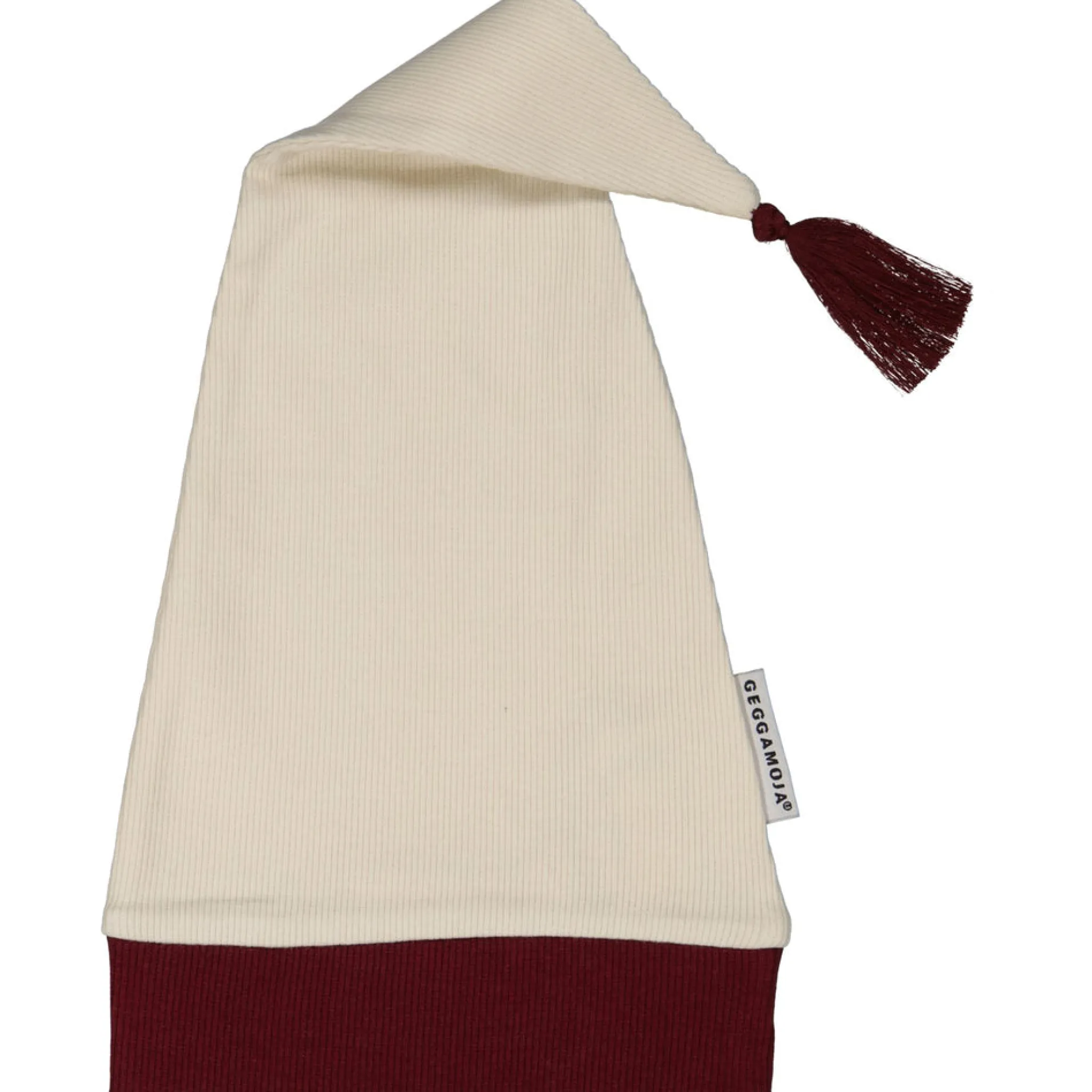 Mysigaste tomteluvan i ribbad bomullstrikå. Beige med vinröda detaljer.