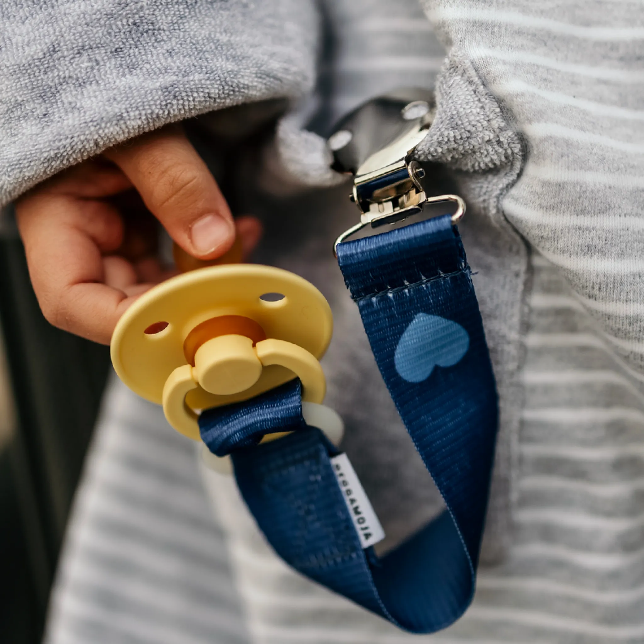 Napphållaren passar de flesta nappar på marknaden. Napphållaren är tillverkad av polyester med nickelfritt metallspänne och en elastisk ring av silikon.