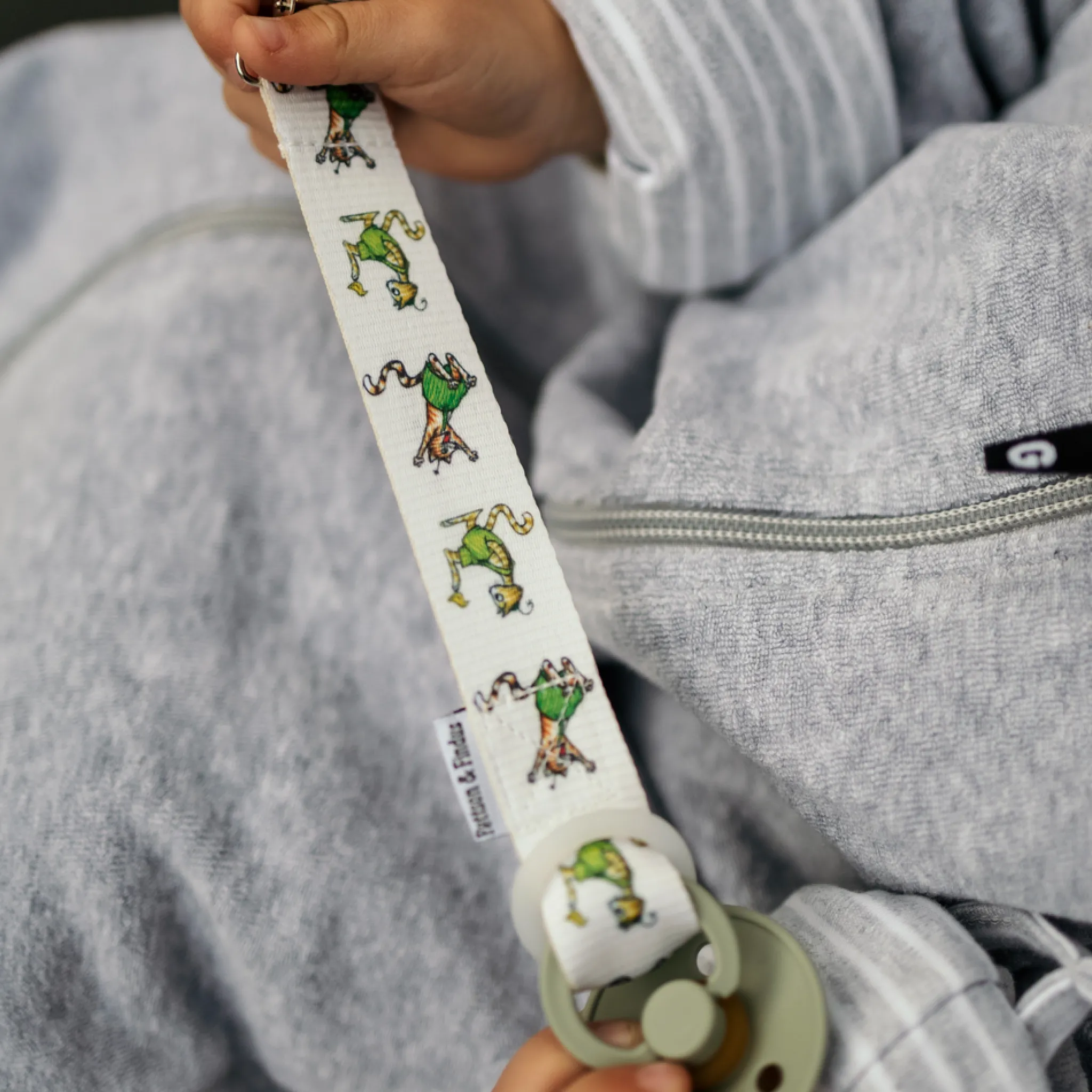 Napphållaren passar de flesta nappar på marknaden. Napphållaren är tillverkad av polyester med nickelfritt metallspänne och en elastisk ring av silikon.